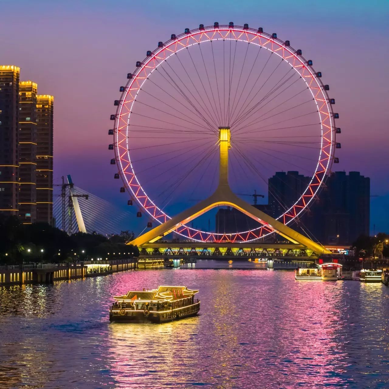每个女孩子都曾有这么一段迷恋摩天轮的时间。从天空上俯瞰深邃的黑夜,摩天轮的每节车厢里都装满了爱。作为世界唯一一座建在桥上的摩天轮,天津之眼的高度甚至超过了伦敦之眼。