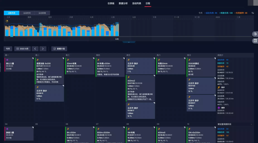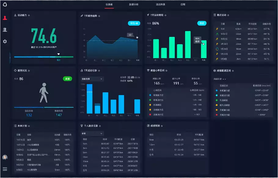 仪表板集中展示个人训练近况,包括训练负荷、运动能力、近7天运动概况及未来7天训练安排等信息。