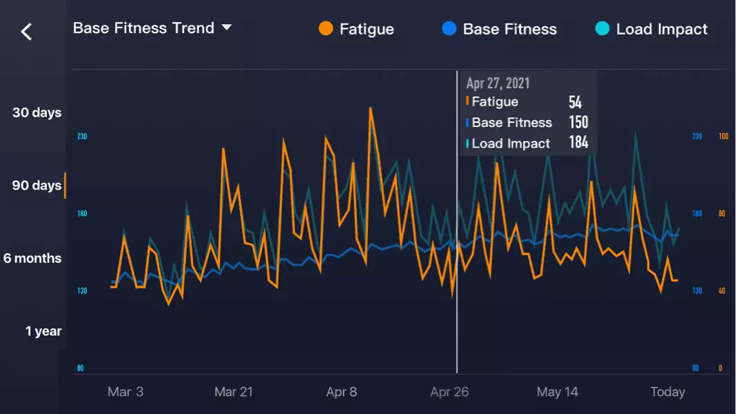 同样,一次糟糕的训练也并不意味训练遭遇瓶颈。EvoLab评估用户的刺激负荷(过去7天的训练负荷)和适应负荷(过去6周的训练负荷)。