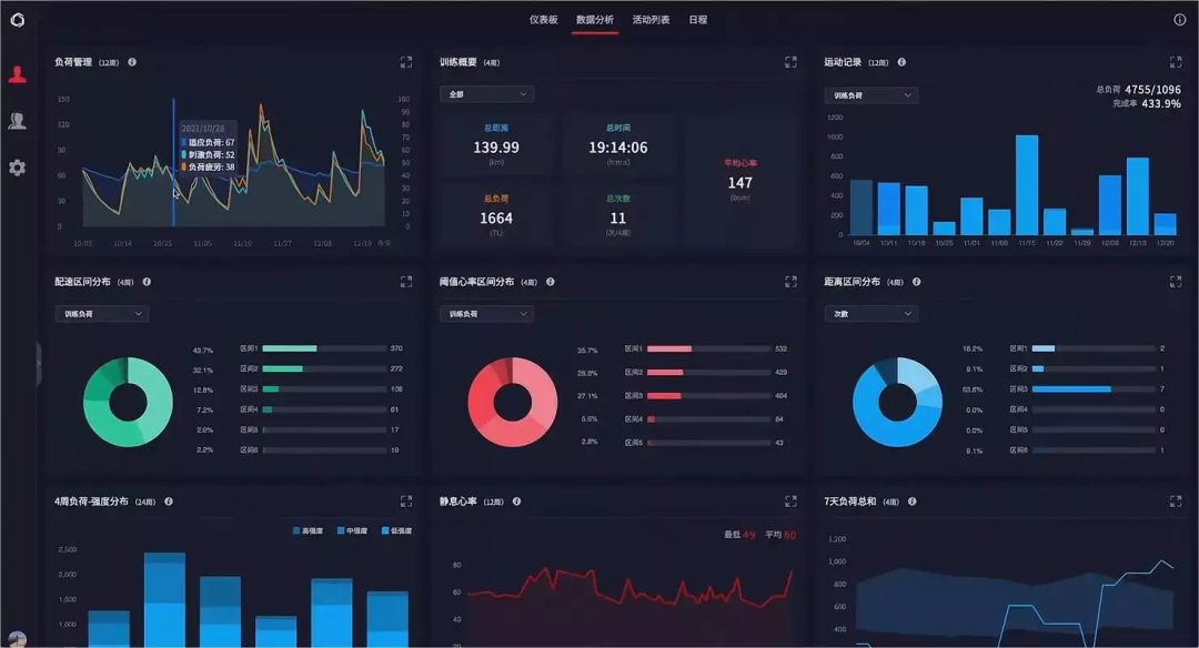 数据分析则围绕个人体能及训练,展示更多体能相关数据,满足体能分析需求,为训练计划的制定及赛事活动安排提供辅助信息。