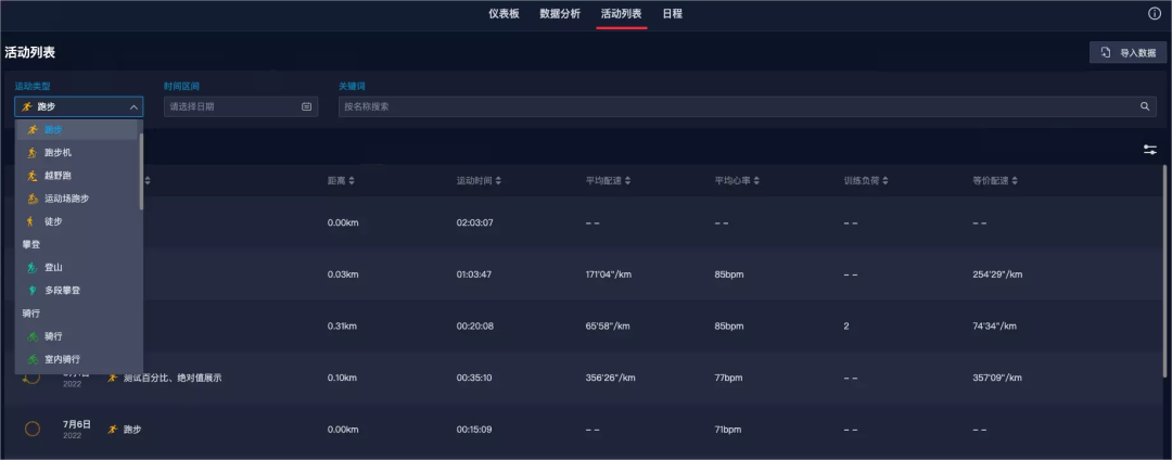 而在活动列表中,可以快速浏览运动记录,通过活动名称,日期和运动类型等数据快速查找对应运动记录。