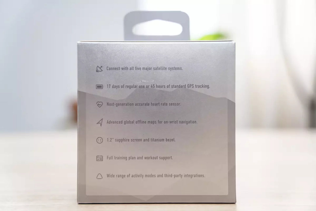 背面罗列了7大产品亮点:支持五大卫星系统、GPS模式续航45小时+日常使用续航17天、全新心率传感器、离线导航、1.2英寸蓝宝石镜面+钛合金面圈、训练辅助功能和多样运动模式。