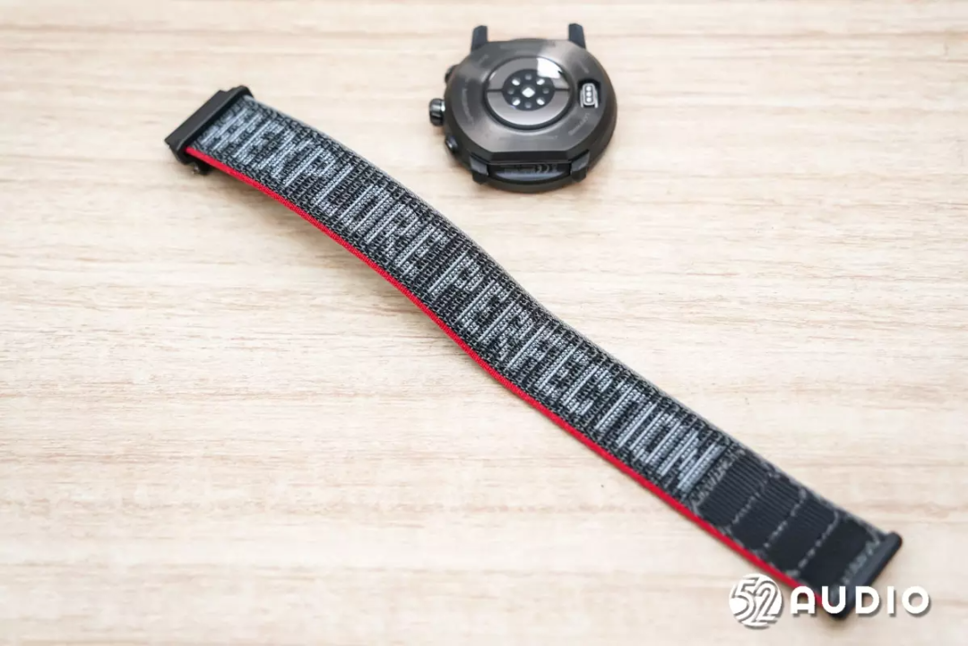 织物快拆表带整体为黑色,两侧分别为灰色和红色,中间用提花工艺绣出“EXPLORE PERFECTION”的Slogan字样,意为“追求极致”。