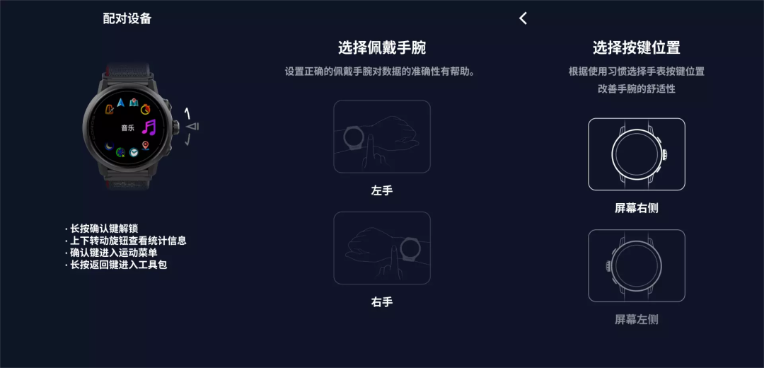 安装COROS APP添加绑定手表时,可自由选择佩戴手腕和按键位置,右手佩戴时可选为旋钮在左,屏幕同步旋转180°,非常方便左撇子们的日常使用。
