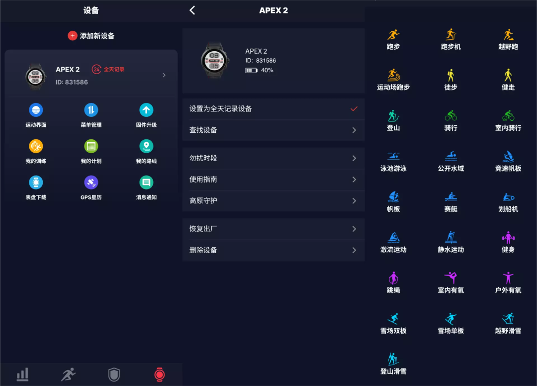 其中从运动类型选择界面可见,COROS APEX 2支持多达7类共25种运动模式,在视觉上用颜色作区分,同时配有生动的图标。