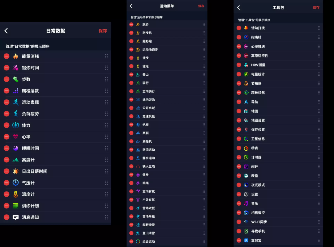 统计信息(日常数据)、运动菜单和工具包的项目也可以自由增减、排序,方便定制符合自身需求的设置。