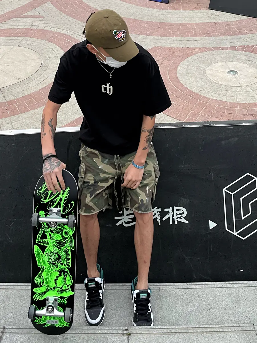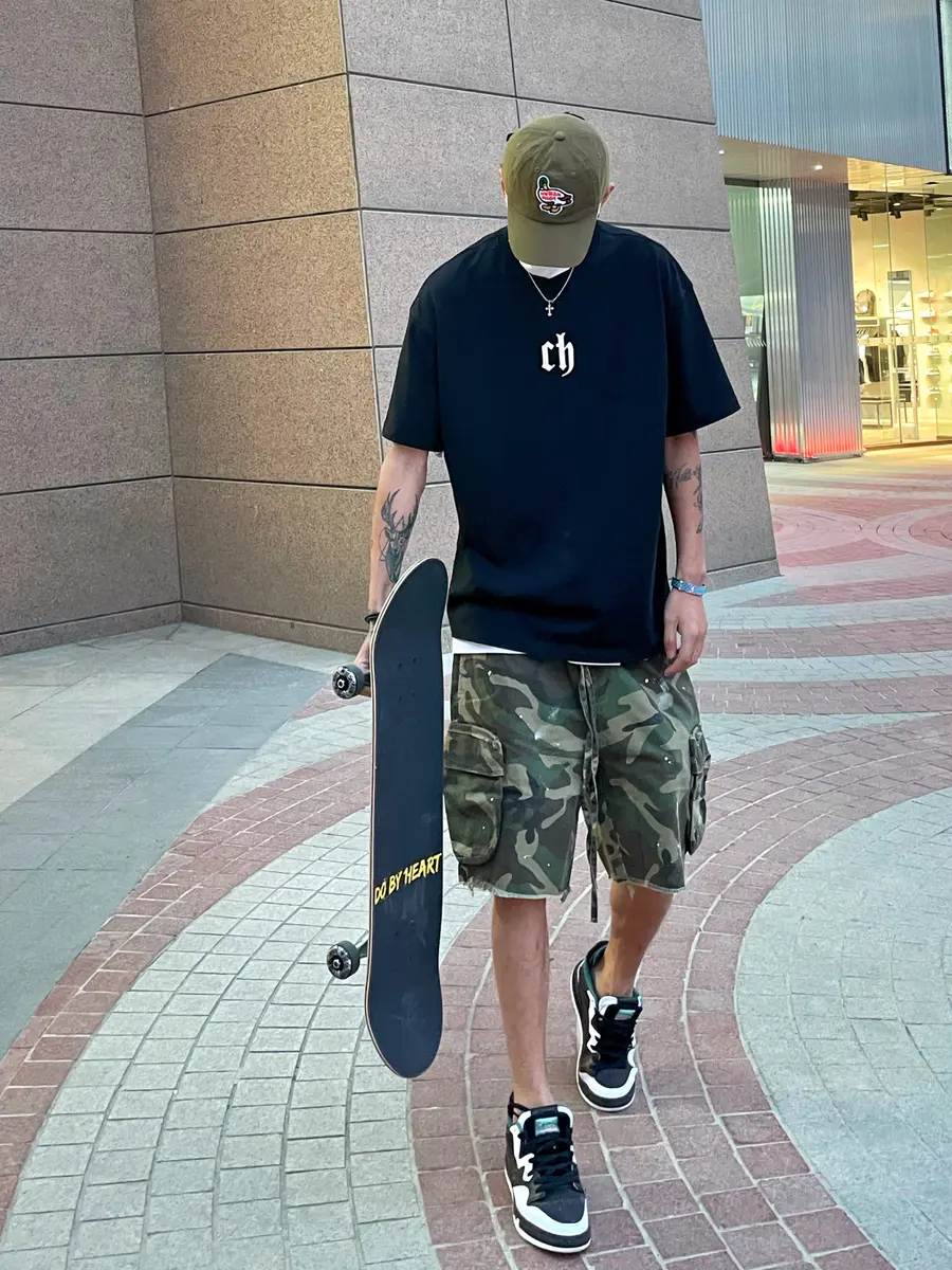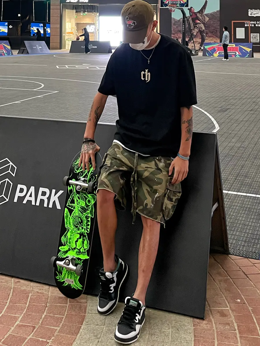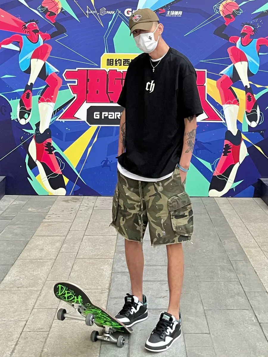 再搭配一条迷彩短裤+一双李宁的板鞋