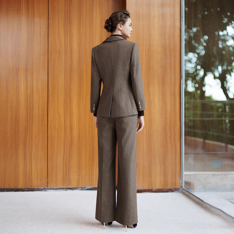 微阔肩 + 收腰剪裁,既能撑出 “头肩比王者” 的气场,又不会显臃肿;袖口、驳领的金色纽扣是点睛之笔,低调中透出精致细节。