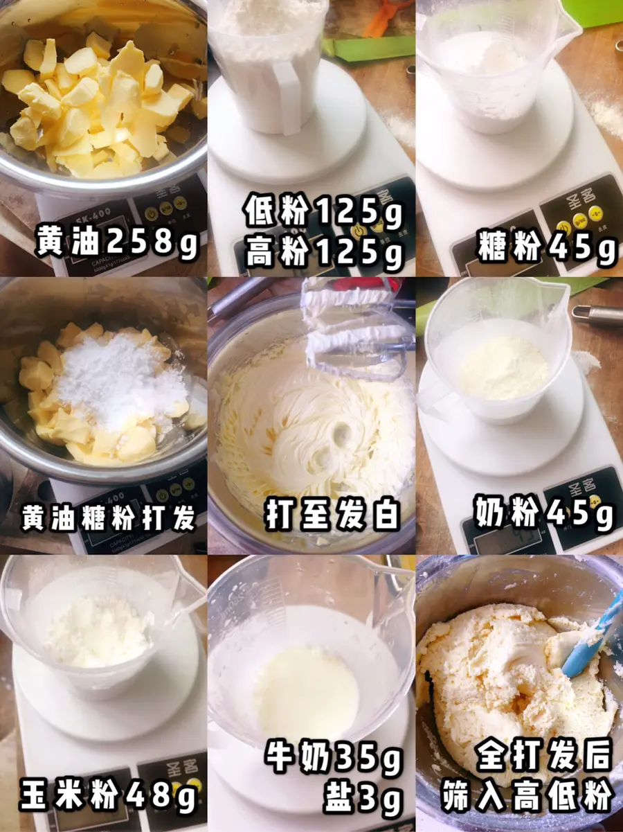 ✅材料:安佳无盐黄油258g(总统也好吃),高粉125g,低粉125g,奶粉45g,糖粉45g,玉米粉48g,牛奶35g,盐3g