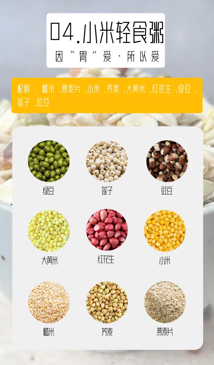 杂粮的选择很多,不过做起来也实在是麻烦,一次要买太多种食材不说,关键买多了还不一定都能吃得完。所以,在这里跟大家推荐一款均衡搭配、免挑免洗、拆包即煮的杂粮粥——天方健「食养小轻粥」。