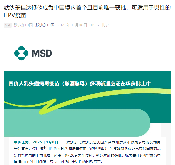 此次对男性群体放开接种的是默沙东的佳达修四价HPV疫苗,可预防6、11、16、18亚型的HPV,目前限9-26男性接种。