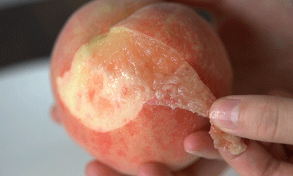 “湖景”桃完全成熟后,皮很薄,能完美剥落桃皮。
