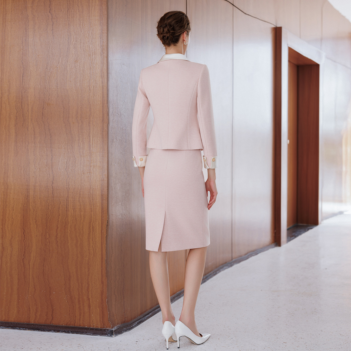 撞色领 + 袖口:奶白镶边是点睛之笔,中和了粉色的柔,多了几分利落的贵气,不用费心搭配饰,光靠细节就足够出挑。。