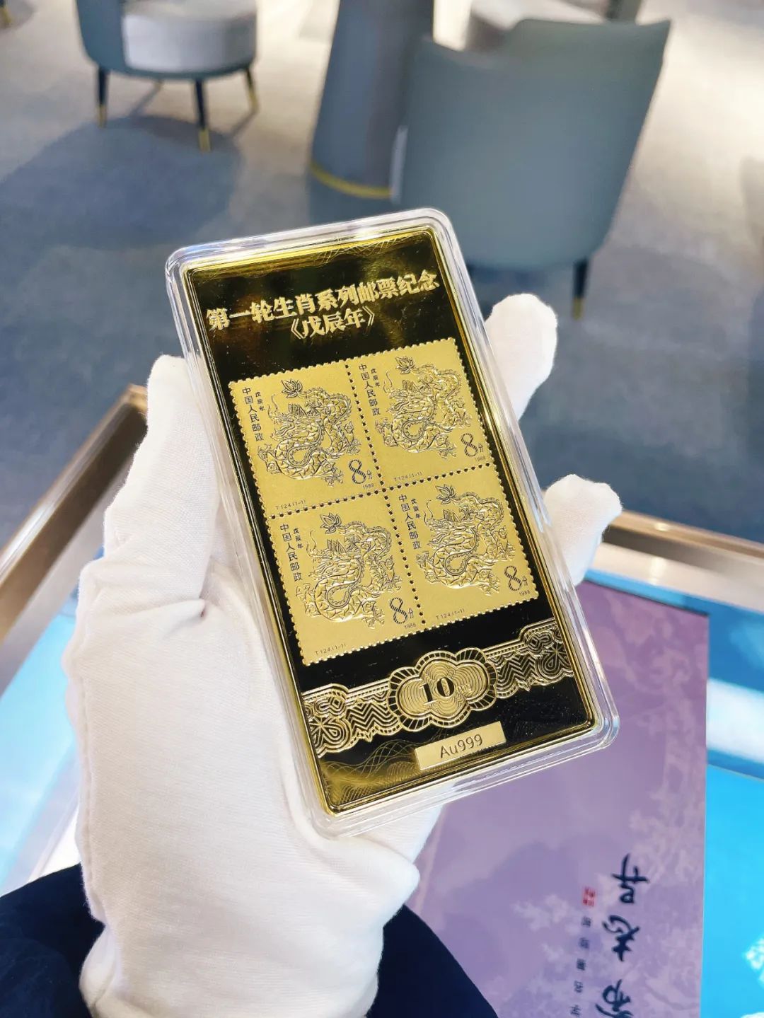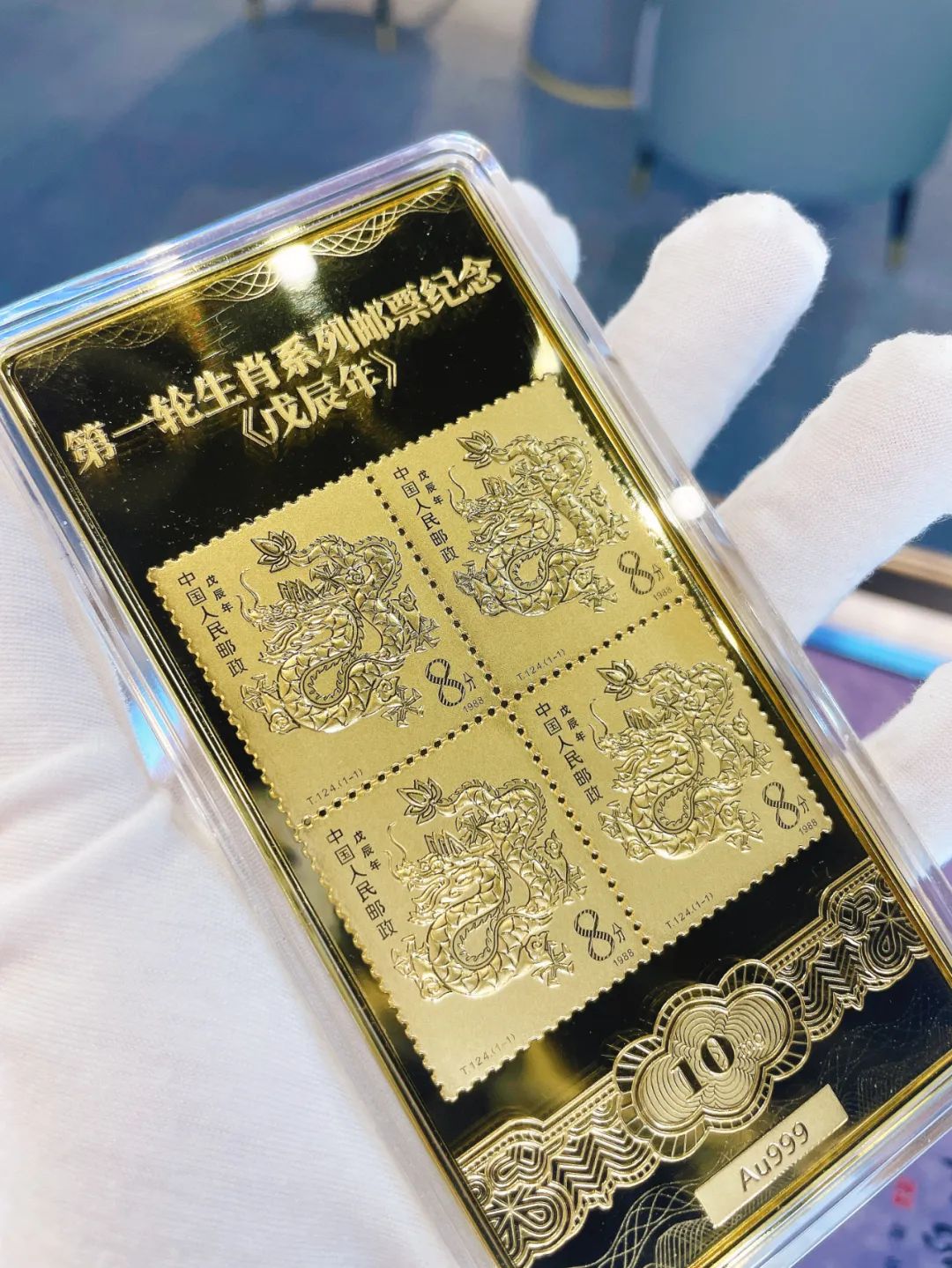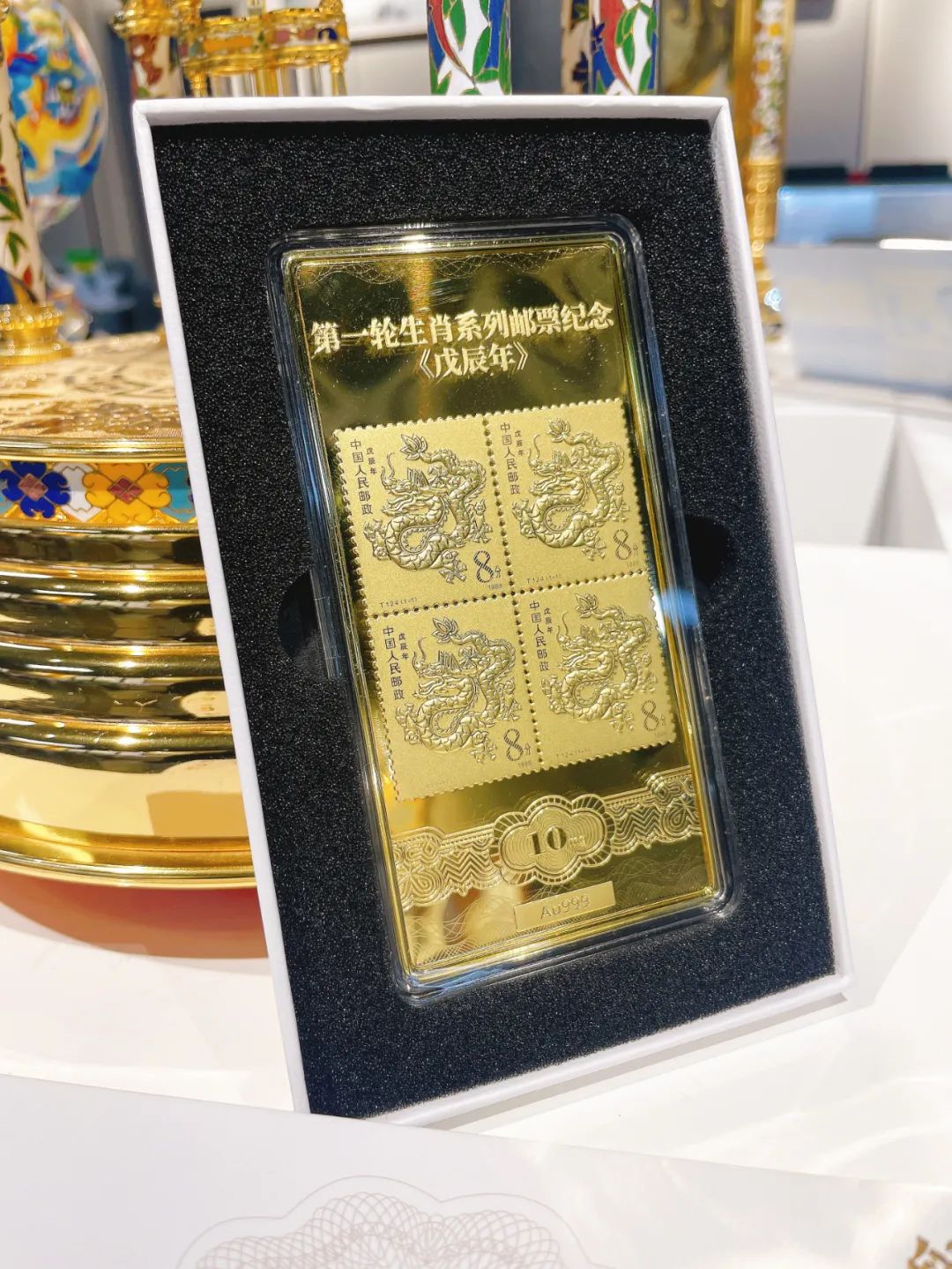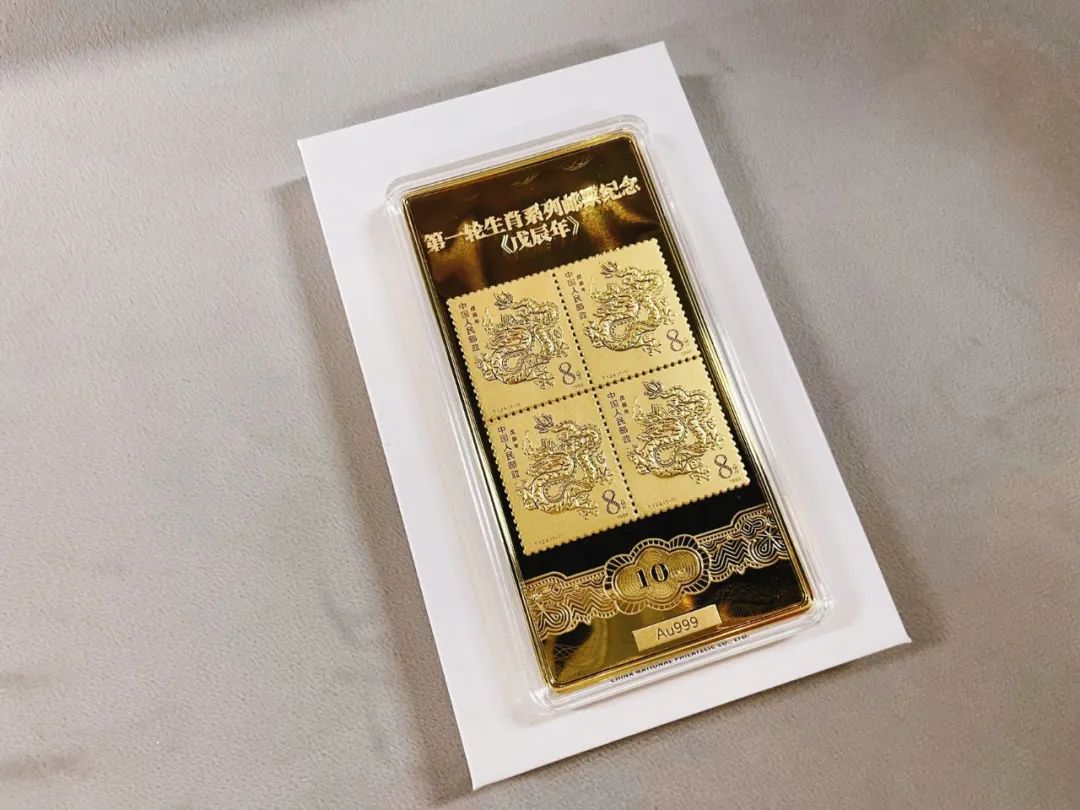 以首轮“龙”年生肖邮票原版为蓝本,通体采用合金镀足金Au99910mg制成,不但构图饱满,整体制作精良,还意义深刻。