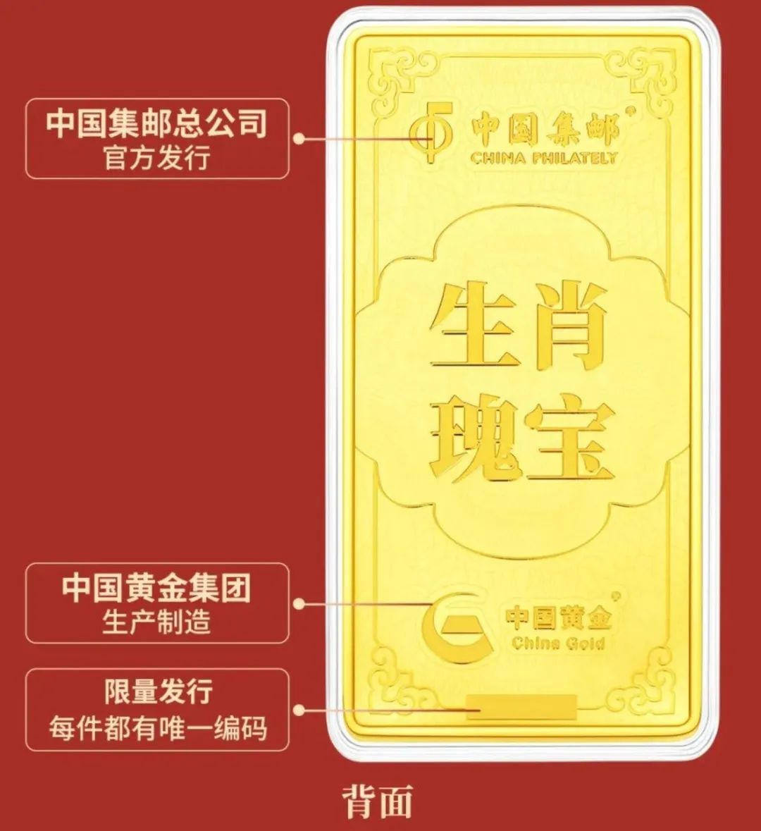 背面有中国集邮和中国黄金两大央企标志,一个是邮票发行机构,一个是国库黄金储备机构,足够官方和权威。