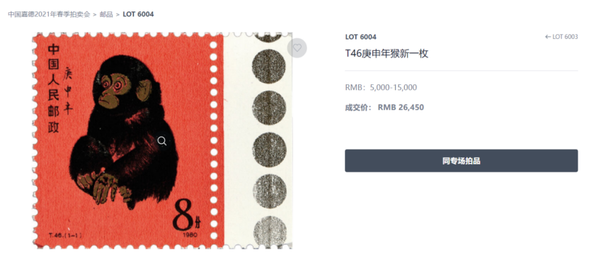 ▲中国嘉德2021春拍-1980庚申年猴票-人民币26450元成交