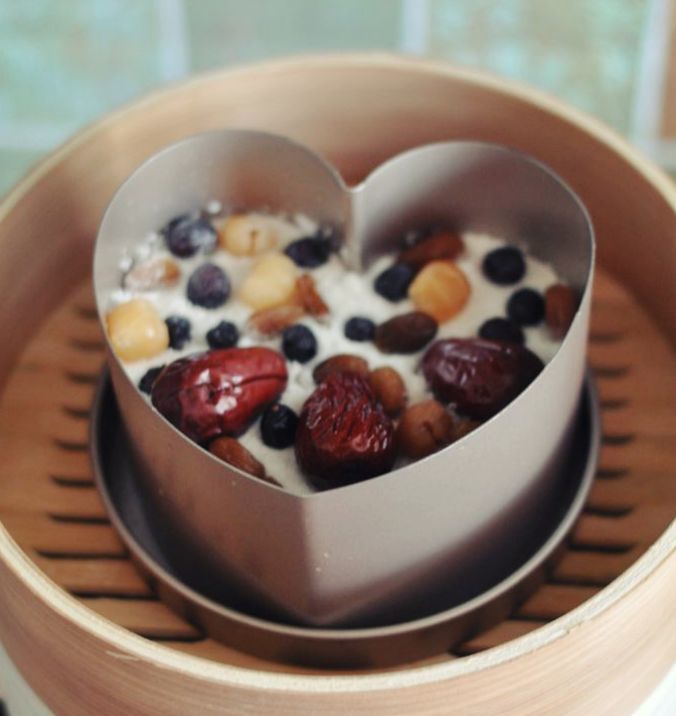 2、重复上面的过程两次,最后一层要将剩余1/3的板栗,葡萄干,大枣,枸杞等放在最上面;