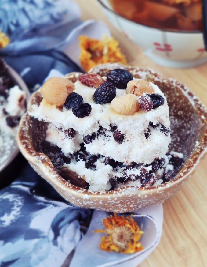 1、准备容器,垫入一块纱布,铺一层粉(1/3的量),撒入一层果干(1/3的量,板栗,大枣,葡萄干,枸杞子);