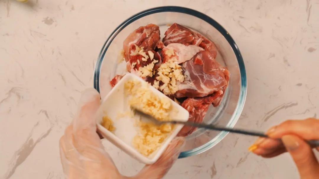 [1]买回来的排骨先放水里泡到发白,中间换两次水,泡好挤干水份。蒜头切碎,把蒜泥、糖、盐、鸡粉、淀粉、蚝油、玉米油一起加入挤干水份的排骨,抓匀后腌制半小时到一小时左右。