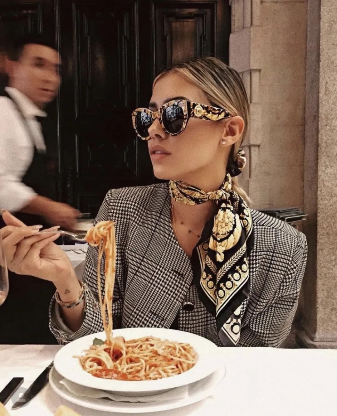 项链和丝巾的叠戴,配上略显浮夸的墨镜,
