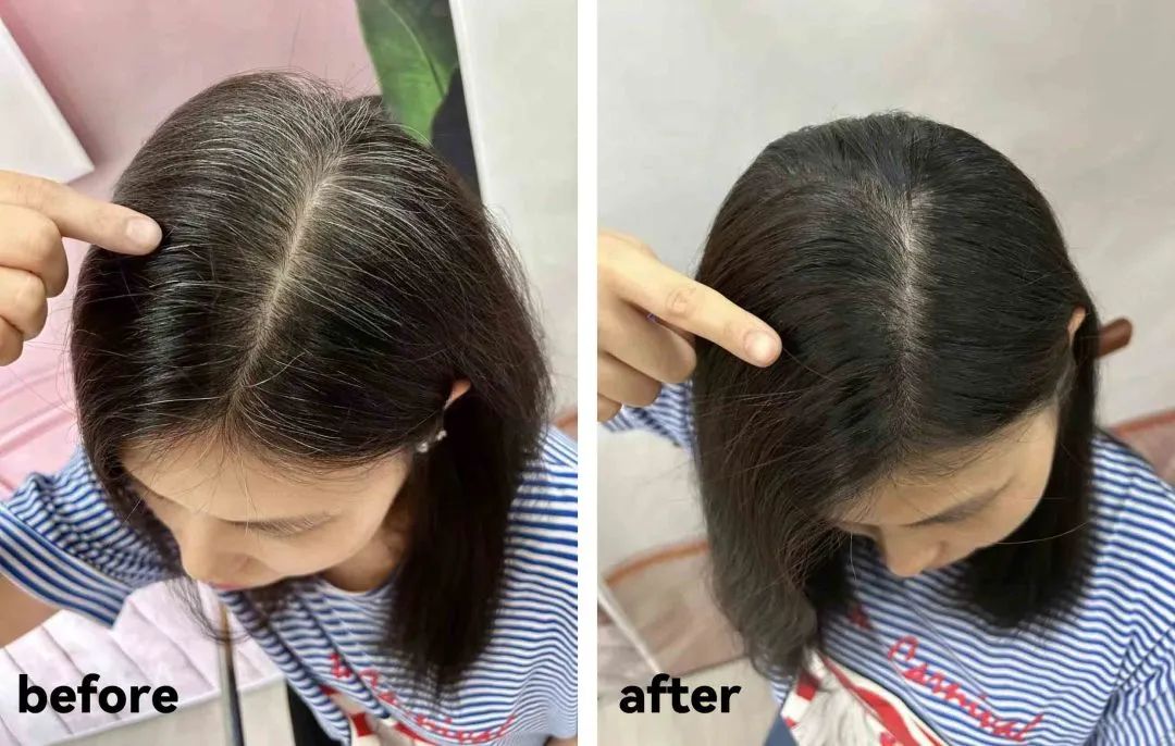 我们来看一下对比,染过的地方变成自然黑色,上色非常均匀,对比之前的白发简直不要太明显!