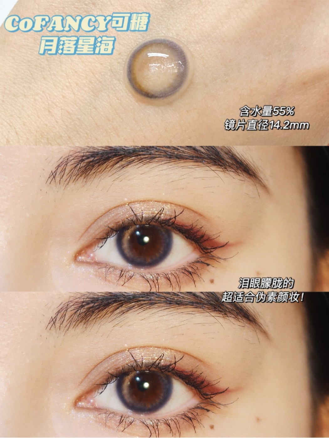 自带显白技能的奶蓝色,天生就有种泪眼朦胧感~瞳孔颜色深也不会夸张,好适合素颜伪心机妆容!