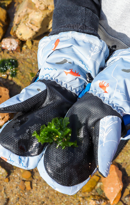 表面采用了微孔防水面料,接缝处还有防水胶条处理,结构紧密,防止钻风进来,同时也有一定的抗磨、抗撕刮的能力,防止孩子摔跤和磕磕碰碰伤到手。
