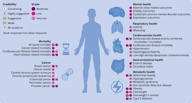而且,吃太多超加工食品,不仅是影响睡眠这么简单。2024年2月28日,《英国医学杂志》刊发的一项大规模的研究显示,过量摄入超加工食品,与32种不良健康结果的风险增加始终相关,包括癌症、严重心肺疾病、心理精神疾病和过早死亡。