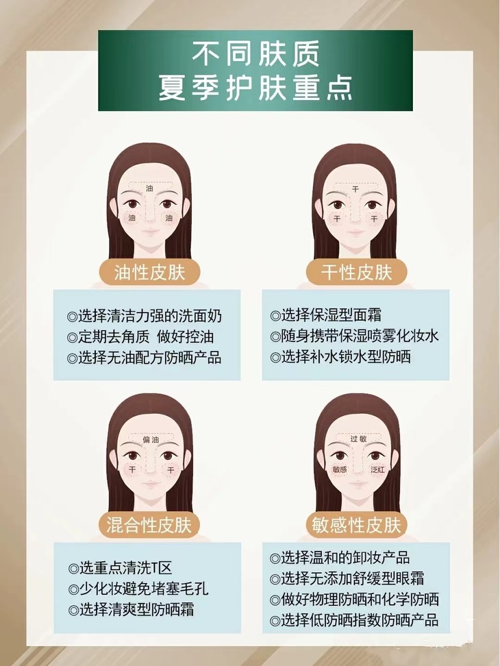 无论何种肤质,夏季非常重要的一点就是防晒!紫外线不仅可造成皮肤损伤,导致皮肤出现晒伤、晒黑、色斑等问题,而且还会加速皮肤老化,即光老化。所以,夏季防晒不仅可以防黑,还可以防老。