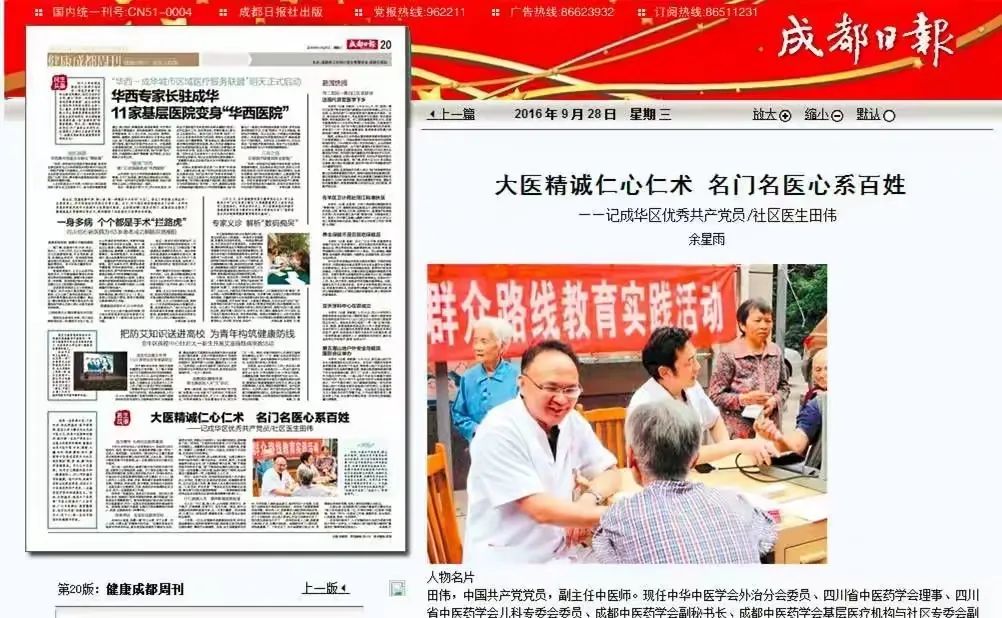 因为在前面十几年,一直负责两个医疗点,直到2006年政策驱动下,医院不能设立医疗点这样的分支机构小门诊,国家又鼓励民营和基层卫生发展。于是,田医生接受部门建议将八里庄医疗点升级为社区卫生服务站,将新鸿路医疗门诊改建为中西结合诊所。继续下沉基层,为更多居民提供更丰富的医疗服务,长期受到省、市、区卫健领导认可,且成为四川省中医型社区的长期参观代表点位,田医生因此还被评为成华区和社区的优秀共产党员。