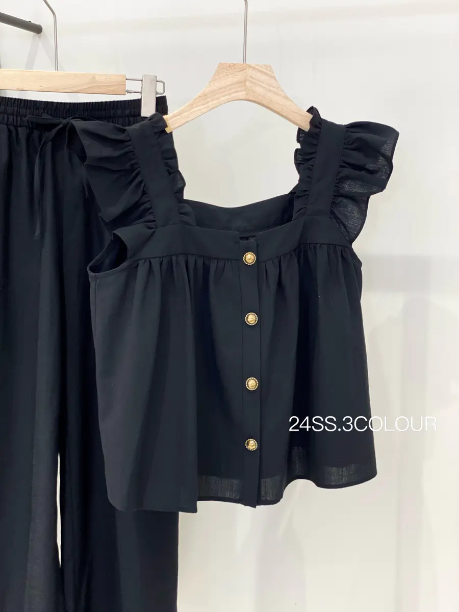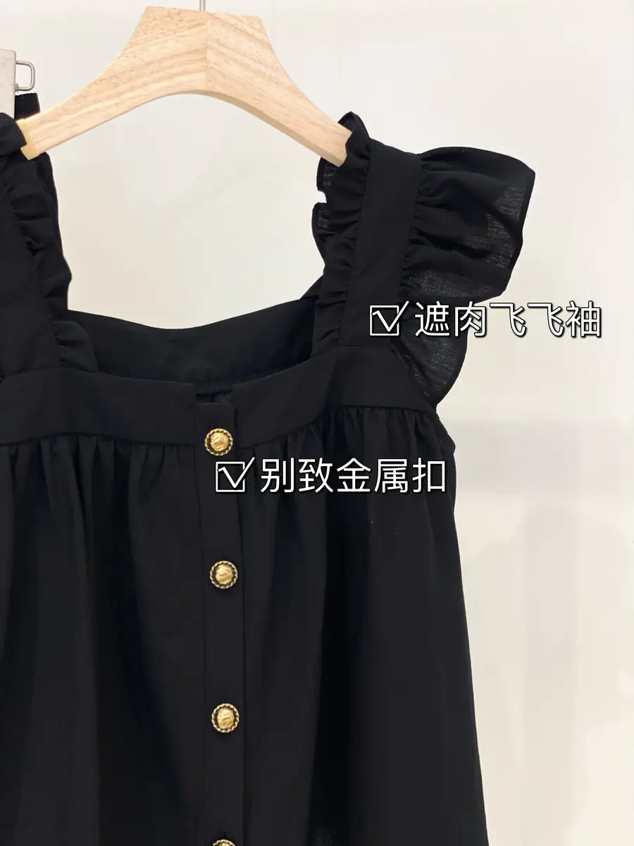 这个上衣采用的宽边飞飞袖设计,比一般的背心吊带更加显瘦,宽肩以及觉得手臂肉肉的妹子都可尝试一下,非常遮肉