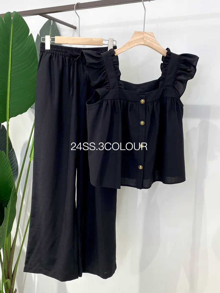 下装搭配的是基础好穿的松紧腰阔腿裤,包容度+++,不挑身材和腿型,并且空荡的裤腿夏天更凉爽;