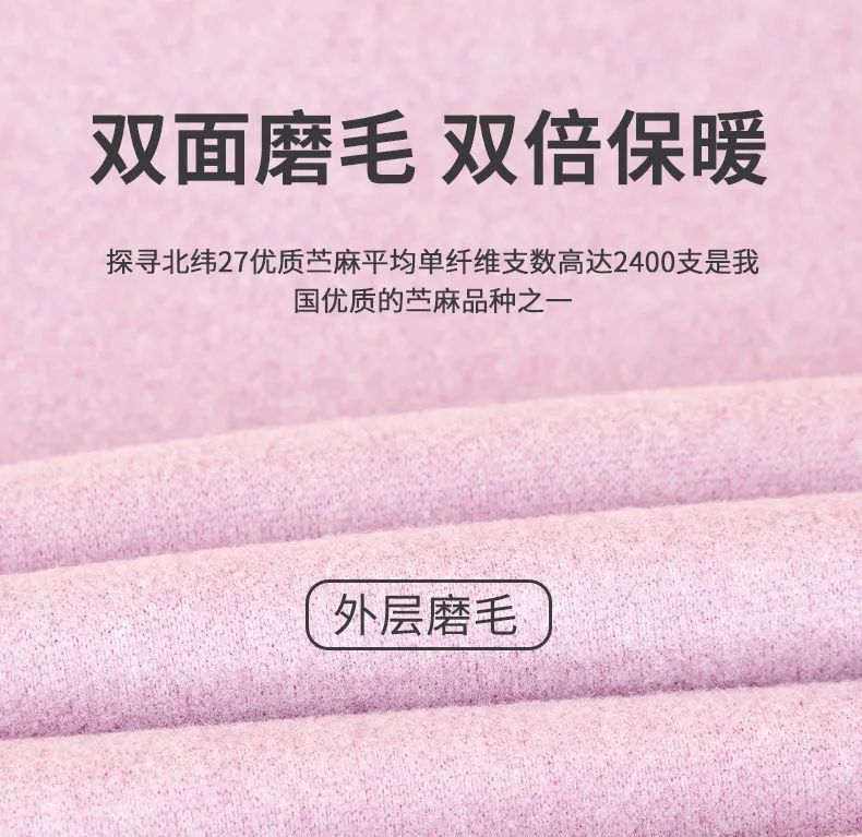 双面磨毛,双倍保暖。羊绒+蚕丝唤醒身体热能,蓄热锁温。