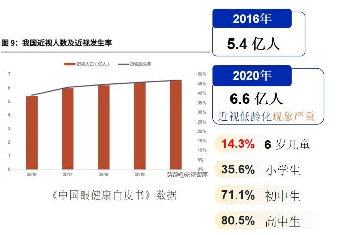 我们首先来看一组数据,2016年,我们国家有5.4亿的近视人口,2020年,增加到6.6亿,短短几年时间,近视人数增加了1个多亿。而且,更让人但心的是,6岁儿童的近视率竟然高达14.3%,孩子近视的越来越早。这些早发性近视的儿童,成年后很可能发展成为高度近视,高度近视又会带来白内障、青光眼、眼底疾病等一系列问题,将给个人、家庭带来沉重负担。