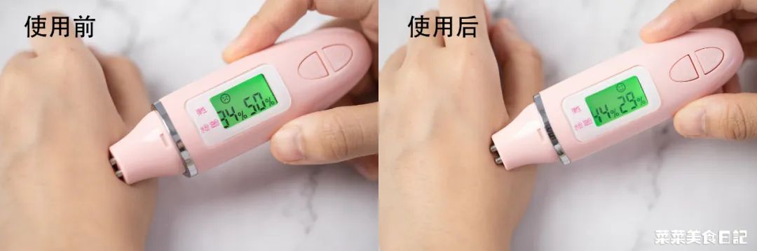 看看使用前后的水分测试图对比,洗完后肌肤的水分还上升了7%↓