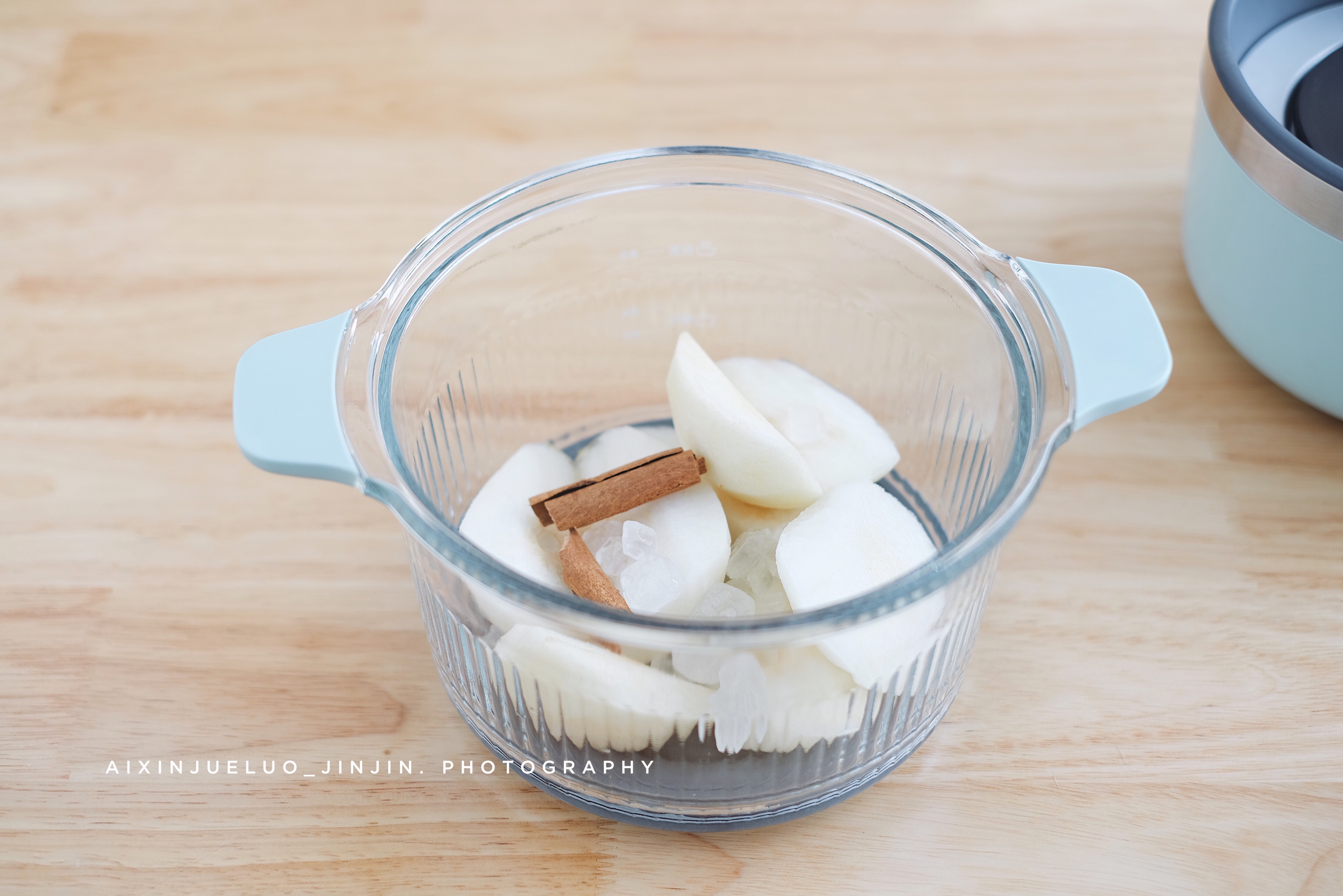 3.雪梨果肉放入东菱养生锅,加一根肉桂,再抓一把冰糖进去