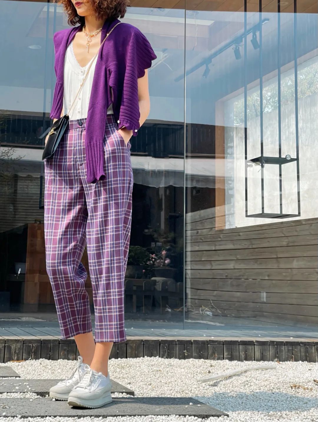 紫色一向是高雅显气质的代表,紫色格子的拼色比起单一纯紫的感觉更轻盈随意。不做作却异常亮眼,这样的单品随意配搭黑/白纯色就不会失手,绝对能让人眼前一亮!