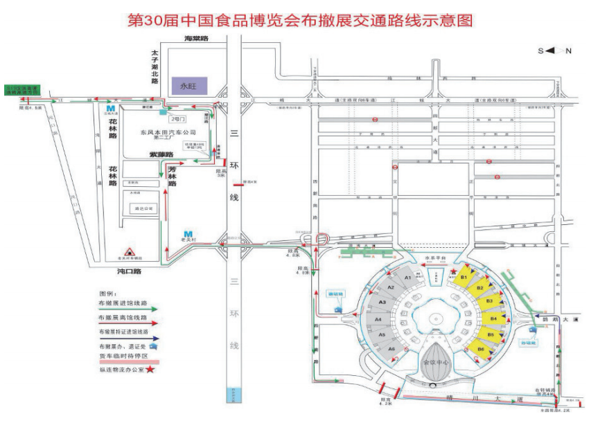 所有布、撤展货运车辆,均按照以上路线,行驶至到达货车待停区,依次排队等待办证进场。武汉国际博览中心布撤展货运车辆临时待停区设立在四新北路延长线(晴川大道至鹦鹉大道方 向右侧一股车道)、晴川大道四新南路至四新北路延长线一段(靠江边第一车道)。临时停车区总长度约2500米,预计可停放大小500辆货运车辆,所有货运车辆均在此等候办证进场。