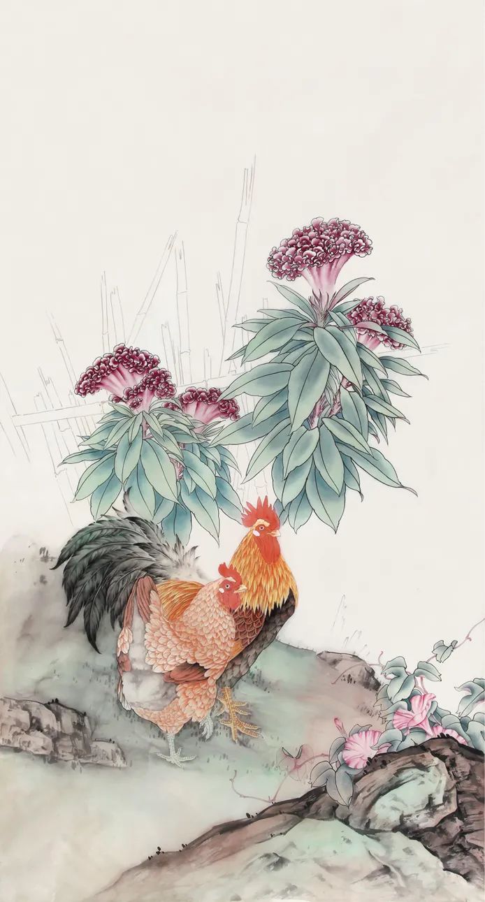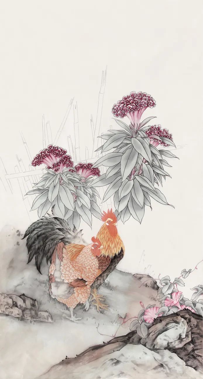 继续加深两只鸡的颜色,逐步深入细节。曙红罩染鸡冠花花头,深入刻画时要注意画面的前后层次。