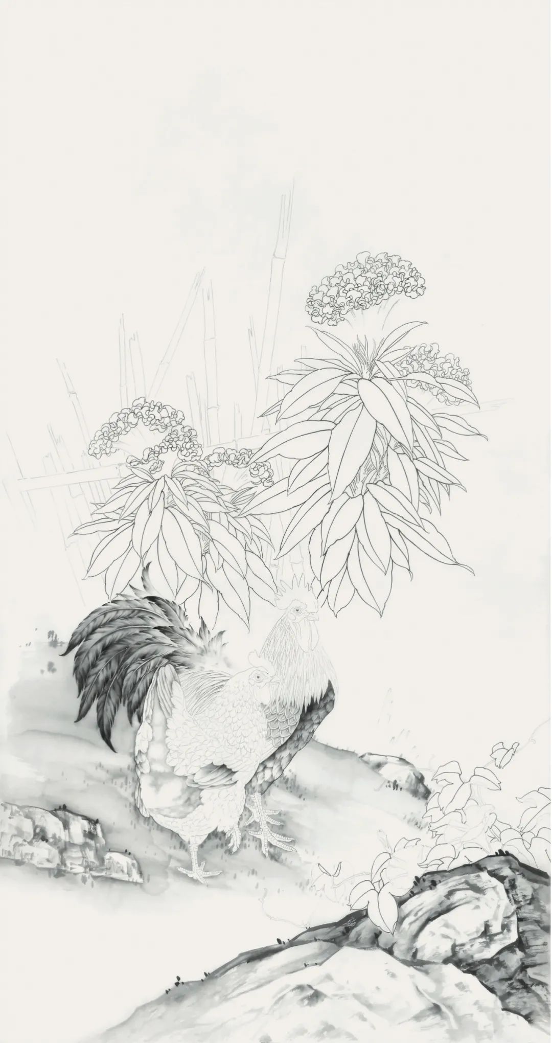 用深浅变化的墨色勾出鸡的各部分结构和羽毛。中墨勾花,稍重墨勾叶。用重墨勾皴石头和坡地,略加渲染。