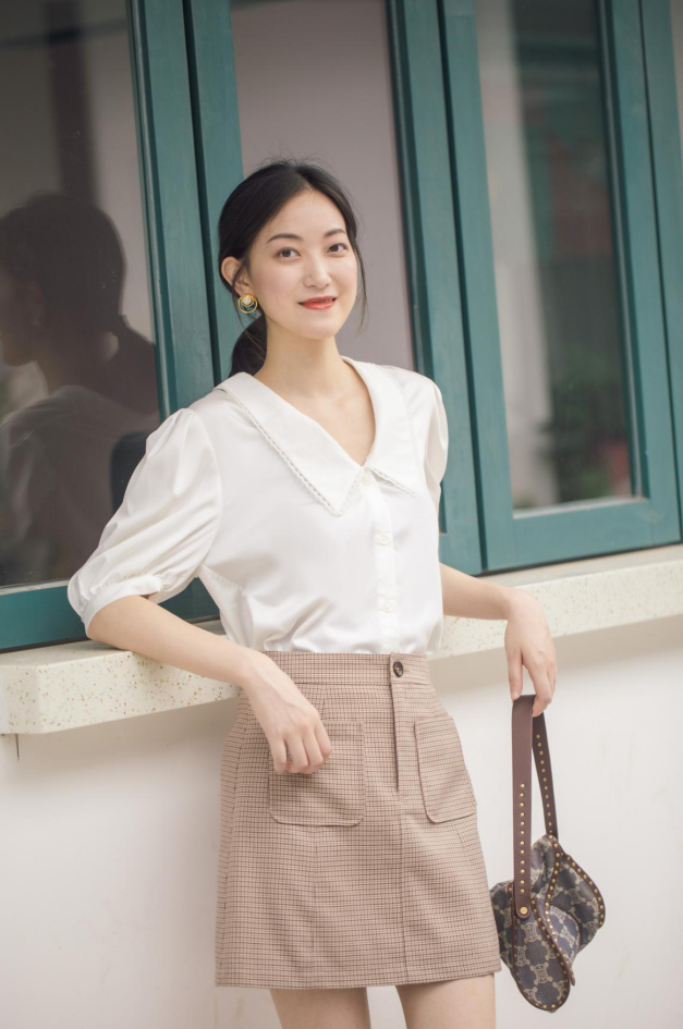 宫廷风短袖搭配千鸟格纹A字短裙,复古又优雅~