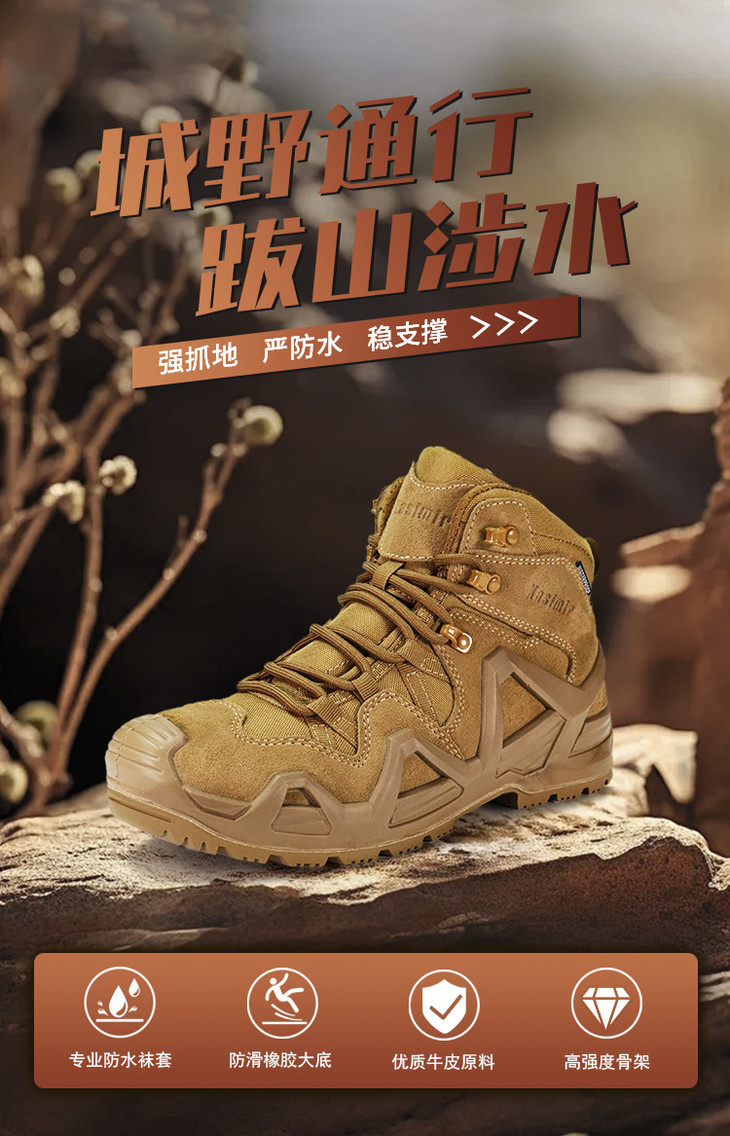 内里 KING-TEX 防水膜,全方位防水。鞋面防水反毛皮+1000D防水尼龙,耐穿耐造!一体成型的PU注塑外骨骼,防崴脚扭伤。
