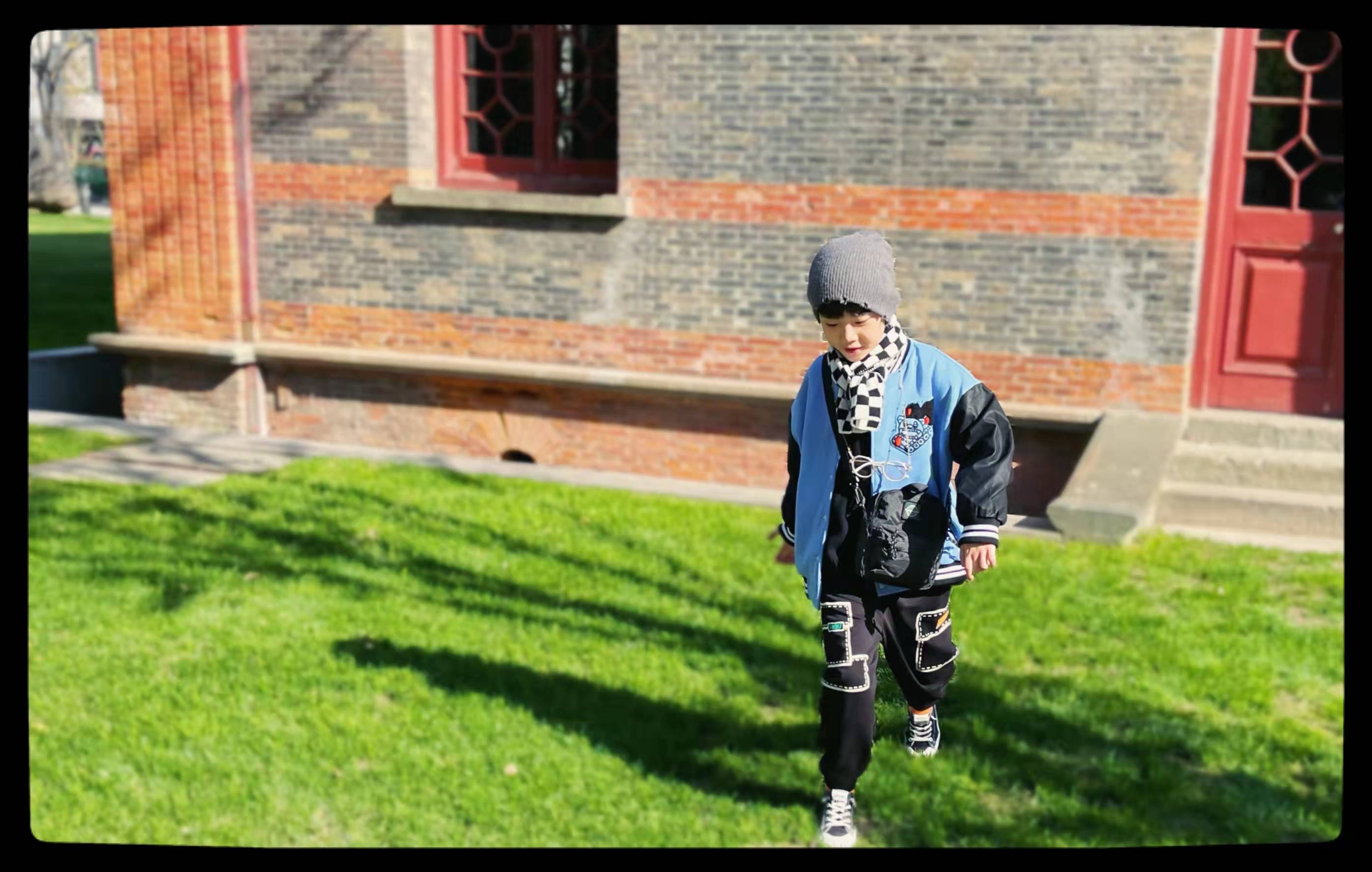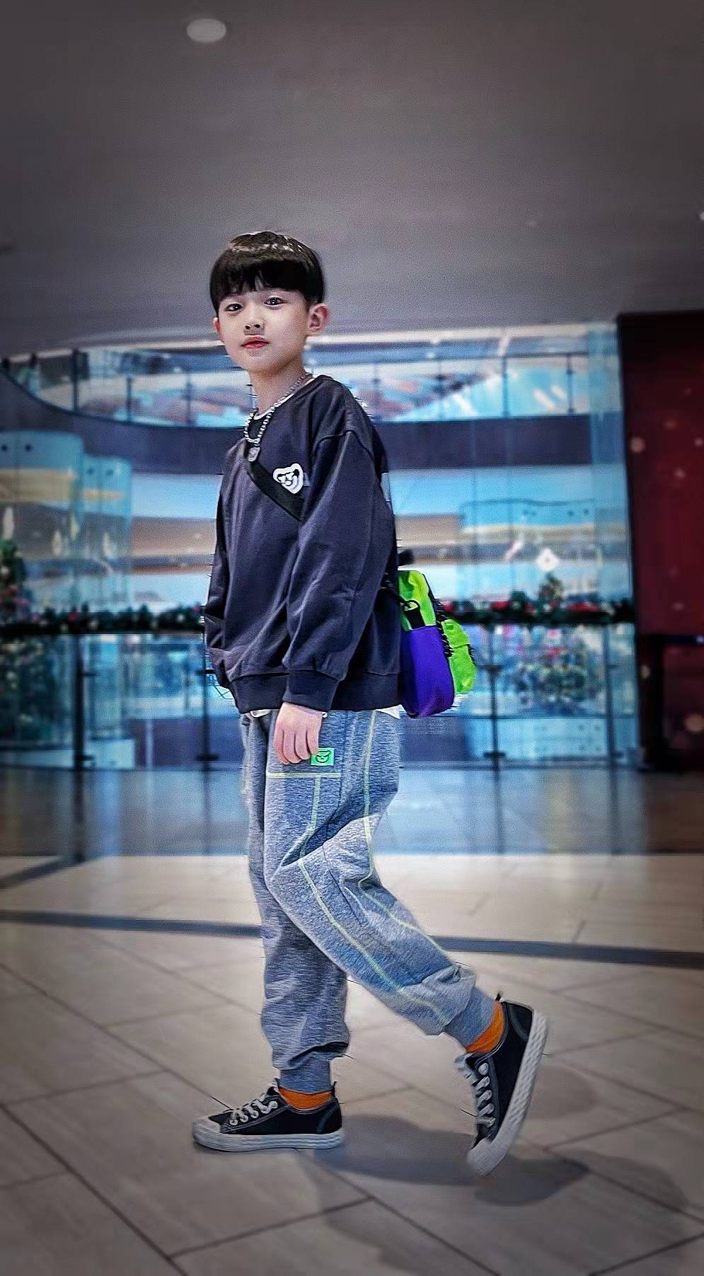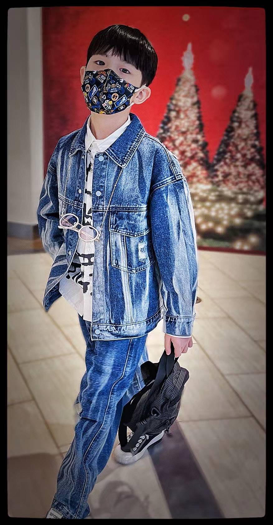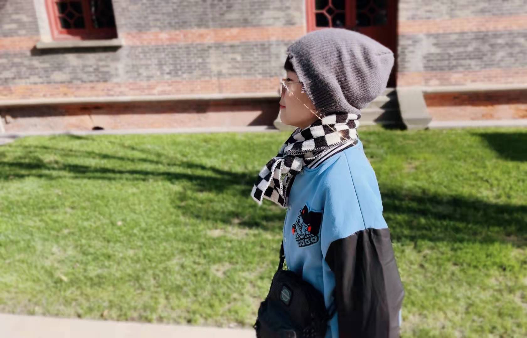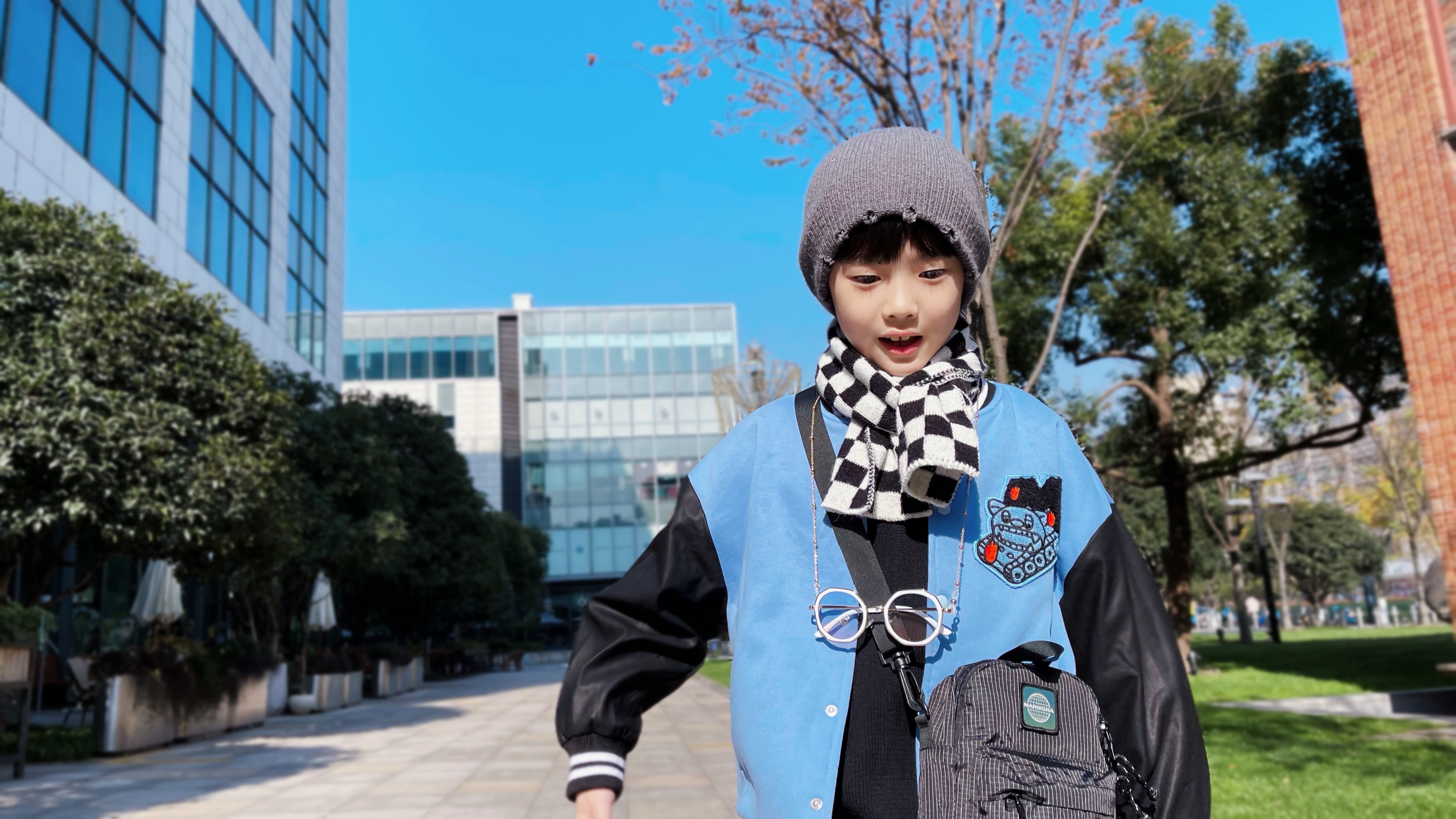 第二套是元气潮酷小少年,异料拼接棒球服外套搭配休闲裤,带上针织帽和棋盘格围巾,兼具温暖和潮酷感!