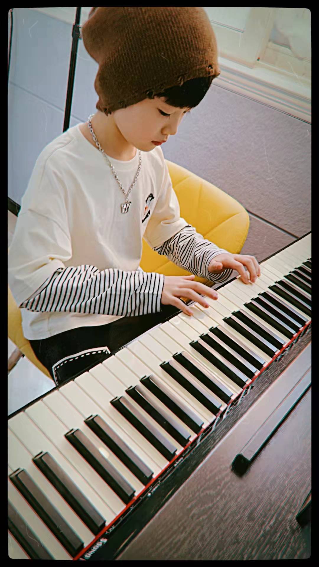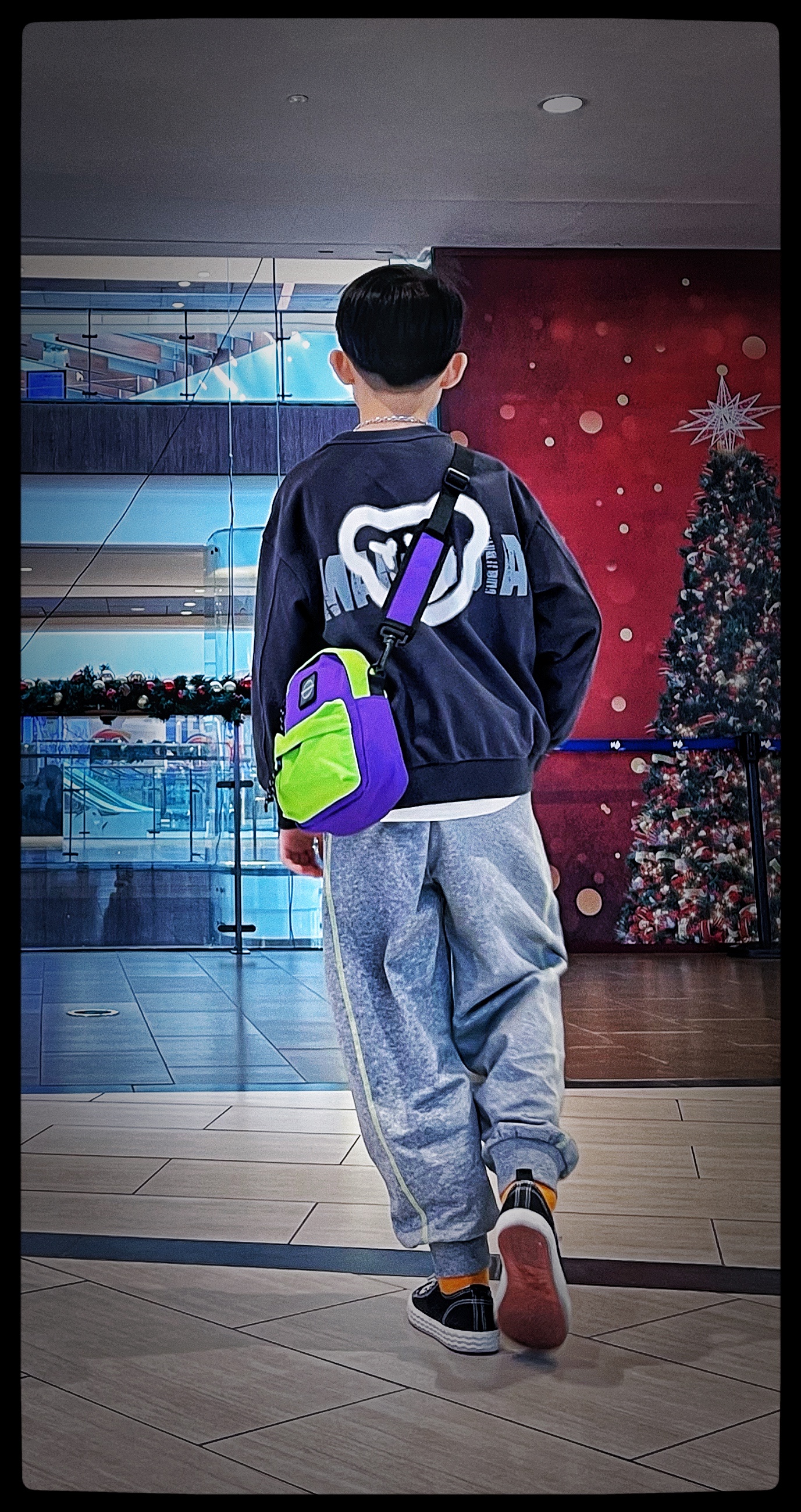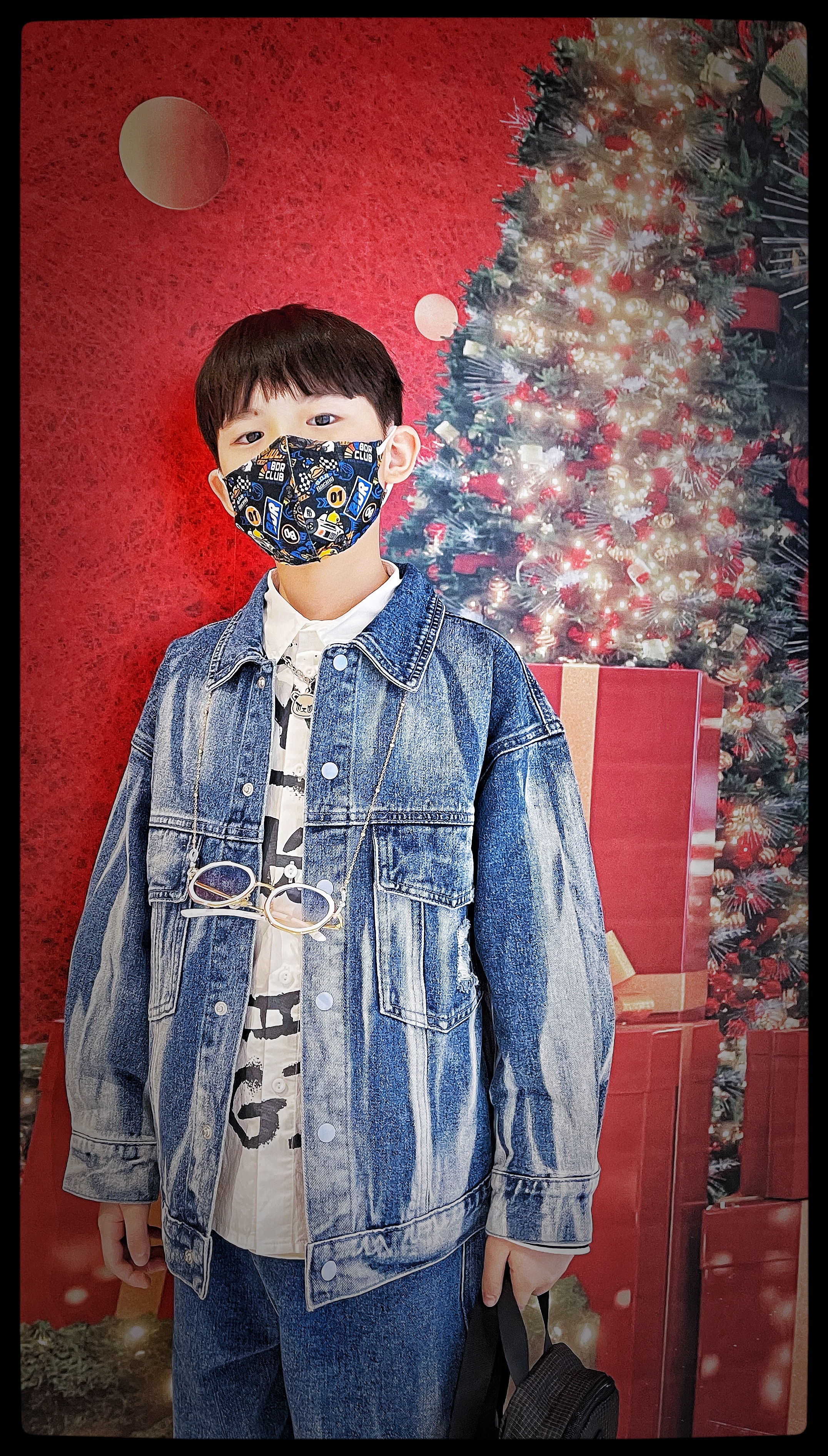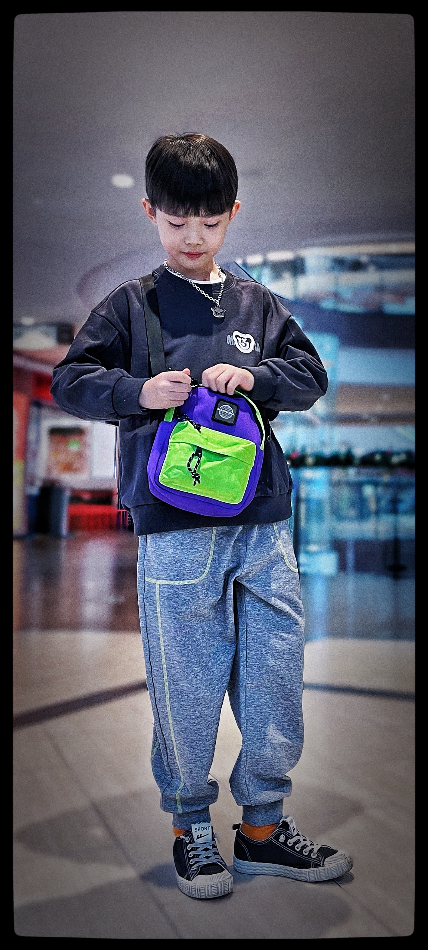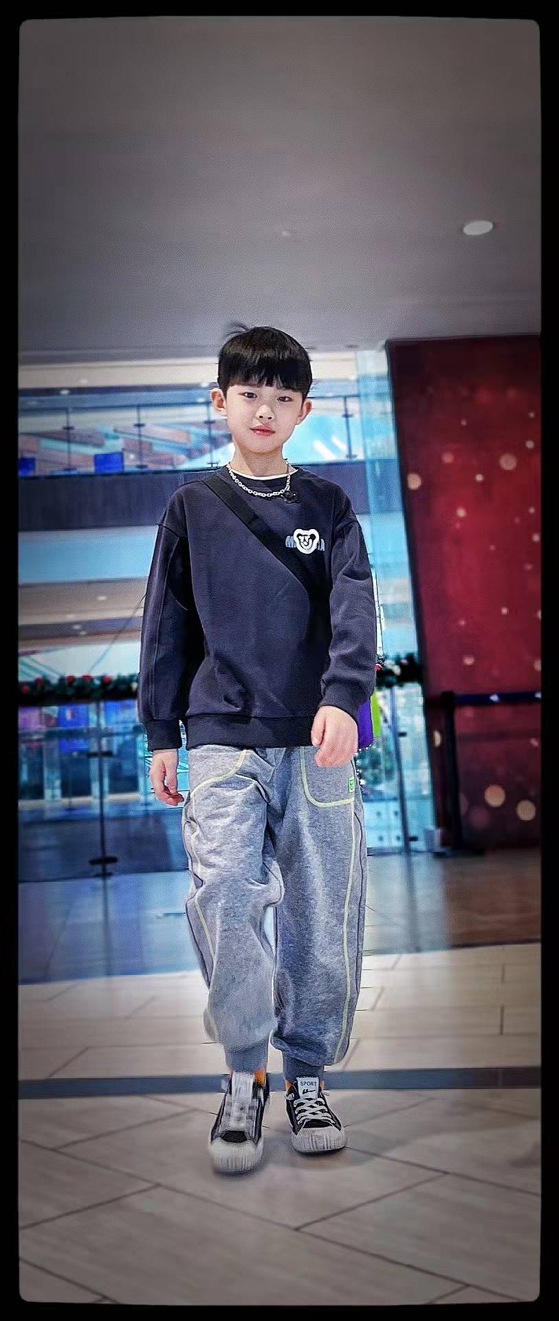 第二套是元气潮酷小少年,异料拼接棒球服外套搭配休闲裤,带上针织帽和棋盘格围巾,兼具温暖和潮酷感!