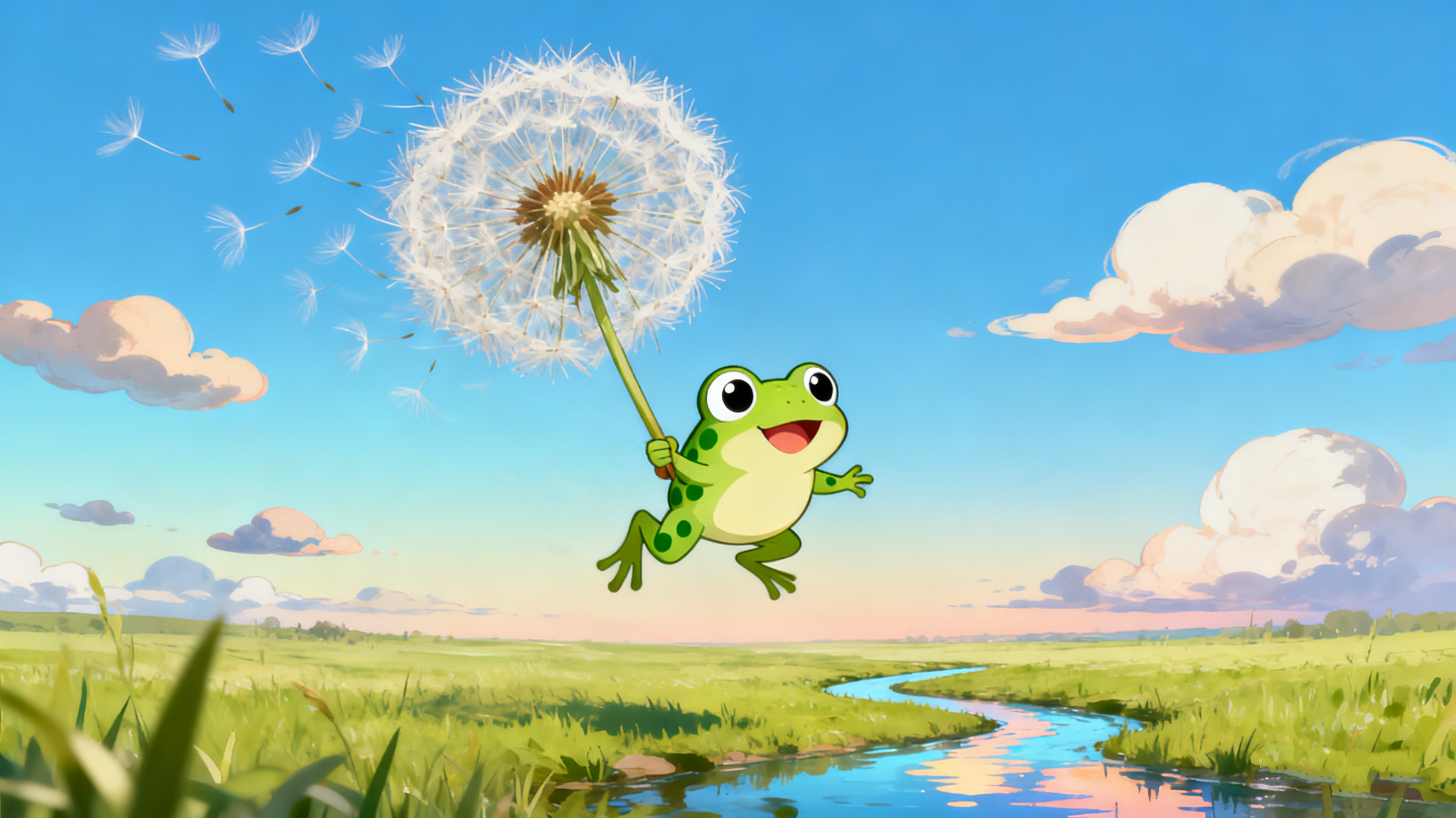 蒲公英带着小青蛙飞飞,它们飞过了村庄,
