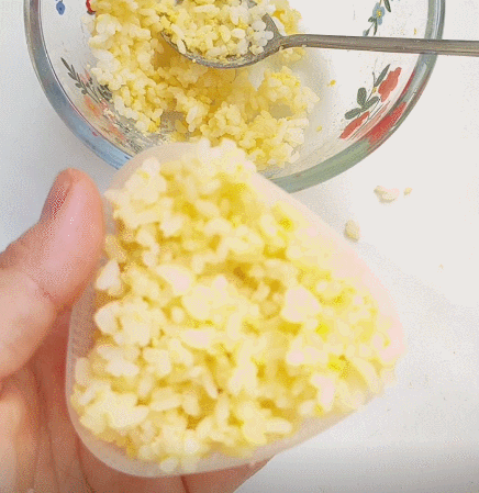 1、蒸好的米饭加入辅食油、蛋黄,并搅拌均匀。(白色饭团直接加少许辅食油即可)