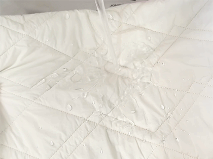 👉她的表层是仿荷叶超高疏水层,就像荷叶一样,会在表面形成斥水层,水泼洒上去会凝结成珠,从衣物上滑落。