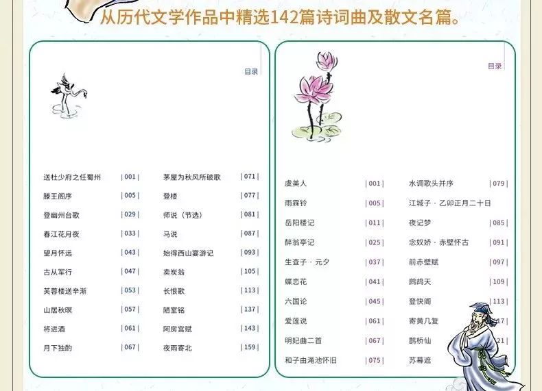 不仅涉及面广,内容也十分丰富,覆盖了先秦到清末各个时期,响应广泛阅读各类古诗文的语文改革要求,精心选取了历代文学作品里最具有代表性的142篇诗、词、曲、文言文、传记等。