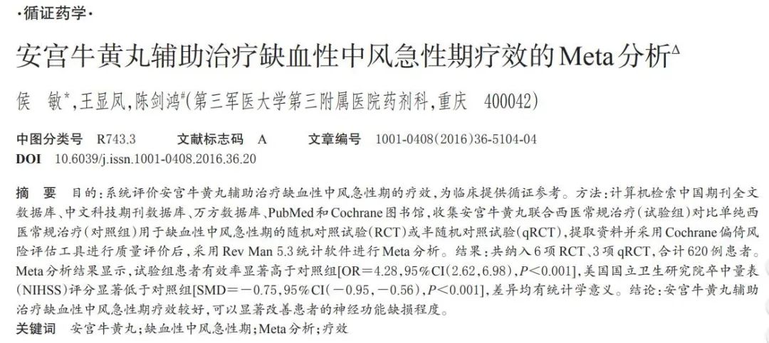 3、《安宫牛黄丸辅助治疗缺血性中风急性期疗效的Meta分析》中明确指出,在西医常规治疗的基础上加用安宫牛黄丸治疗缺血性中风急性期疗效较好,可以显著改善患者的神经功能缺损程度。