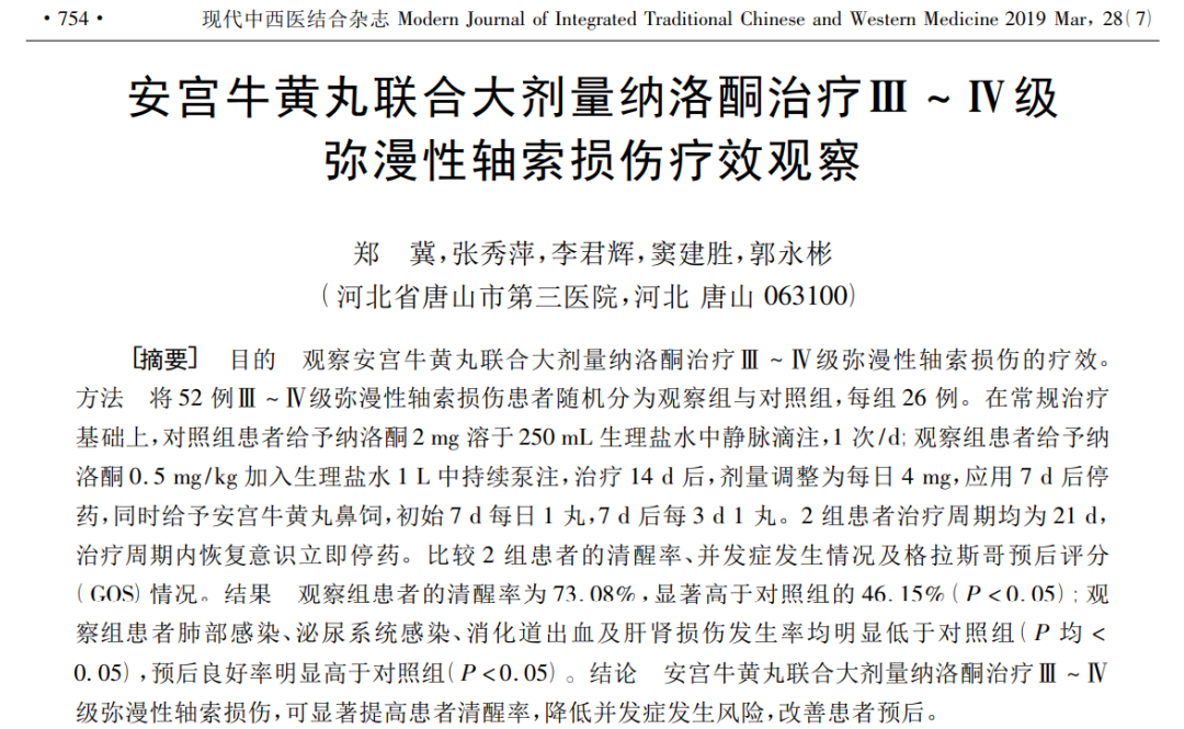 2、《安宫牛黄丸联合大剂量纳洛酮治疗Ⅲ~Ⅳ级弥漫性轴索损伤疗效观察》中明确指出,安宫牛黄丸联合大剂量纳洛酮治疗Ⅲ~Ⅳ级弥漫性轴索损伤,可显著提高患者清醒率,降低并发症发生风险,改善患者预后。